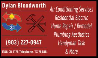 Page 2 • February 28, 2023 • 903-583-3280 5/31/22 Reliance Fasteners OF DENISON LP 115 E. GANDY ST. DENISON, TX 75021 OFFICE: 903-465-0145 FAX: 903-465-0642 JEFF FRANCIS Cell 903-814-3127 jfrancis5419@hotmail.com PAT MILLER Cell 580-920-5575 pmmiller69@aol.com 8/9/22 HGP Fencing / Welding Chain link, wood, pipe and barbed wire. Specializing in automatic gates John Davidson III 903.821.2265 Cole Davidson 903.815.0738 davidsoncole566@gmail.com BINDERY Tx. as covering info@nationwidebinding.com BIBLE and BOOK REPAIR at the BINDERY STOP by For A Free Quote! All work completed @ 1003 N. Center St., Bonham, TX 903-583-3255 Email: info@nationwidebinding.com WE REBIND BIBLES AND OTHER BOOKS! B 5/3/22 Come visit us at either of our locations for amazing daily deals! 2903 B Lee St Greenville, TX 75401 2626 N Center St Bonham, TX 75418 Mention this Ad from The Leader to get a discount off your purchase *excludes fill-a-bag, Saturdays and Sundays* Liquidation merchandise from Amazon, Wish, Target & other multi department stores. Mon - Sat: 10am - 7pm • Sun: 12pm - 6pm (903) 494 - 5097 E-EDITION ONLINE @ WWW.FANNINCOUNTYLEADER.INFO Fairlie Metal House The GOLD Standard in Metal Manufacturing Metal Building Components • Roofing • Siding • Accessories 903-413-8938 4218 E State Hwy 11 Commerce, TX 75428 fairliemetalhouse.com • marcus@fairliemetalhouse.com Now Open Parts & Service 2/28/23 All Makes and Models Quality Service 903 - 505 - 8352 1348 FM 1552 Leonard, TX 903 - 441 - 3288 Open Mon - Fri: 8 - 4 ||| Sat: 8 - 12 Under New Management The Garage on 1552 Clean up and fix up days are now here for your mower! 15% OFF now until the end of April! COME SEE US! Hurry while it lasts! wildwestelectricllc@gmail.com 1/11/22 Damon Wilder Owner/Master Electrician TECL #36038 / ME #531118 Residential/Commercial 903-227-9608 You Matter There is Help, There is Hope 1-800-273-TALK (8255)