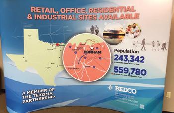 tive sign that will be displayed at three different trade shows in the coming months. She noted how it depicts the lake, the multi-generational population of Bonham and the reference to the Texoma Partnership (Sherman, Denison, Gainesville and Bonham.) She also noted a Bonham map that will be made available to interested parties at the tradeshows that will have marketing information on the backside as well as describing an ad that will be appearing in the digital magazine, Expansion Solution. She further mentioned a video that will be filmed on March 23rd, the 617-acre housing development that is moving ahead and a marketing giveaway that is a credit card sized magnifying glass.