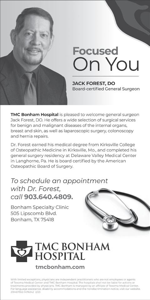 Page 20 • February 28, 2023 • 903-583-3280 12/6/22 - Walk-ins Welcome - Family (Adult & Children) Dentistry - Extraction including Wisdom teeth removal - Implants - Crowns & Bridges - Root Canals including Molar Root Canal - Dentures including immediate dentures, implant support dentures, flexible denture, etc. - Teeth Whitening - Nitrous Oxide sedation, etc. - All Dental Emergency Services 1400 N Center St. Suite 100 Bonham, Texas OFFICE HOURS: 10:00am - 6:00pm (M-F), 9:00am - 2:00pm (Alternate Saturdays) 903-304-5808 www.horatiodental.com greatsmile@horatiodental.com 2/28/23