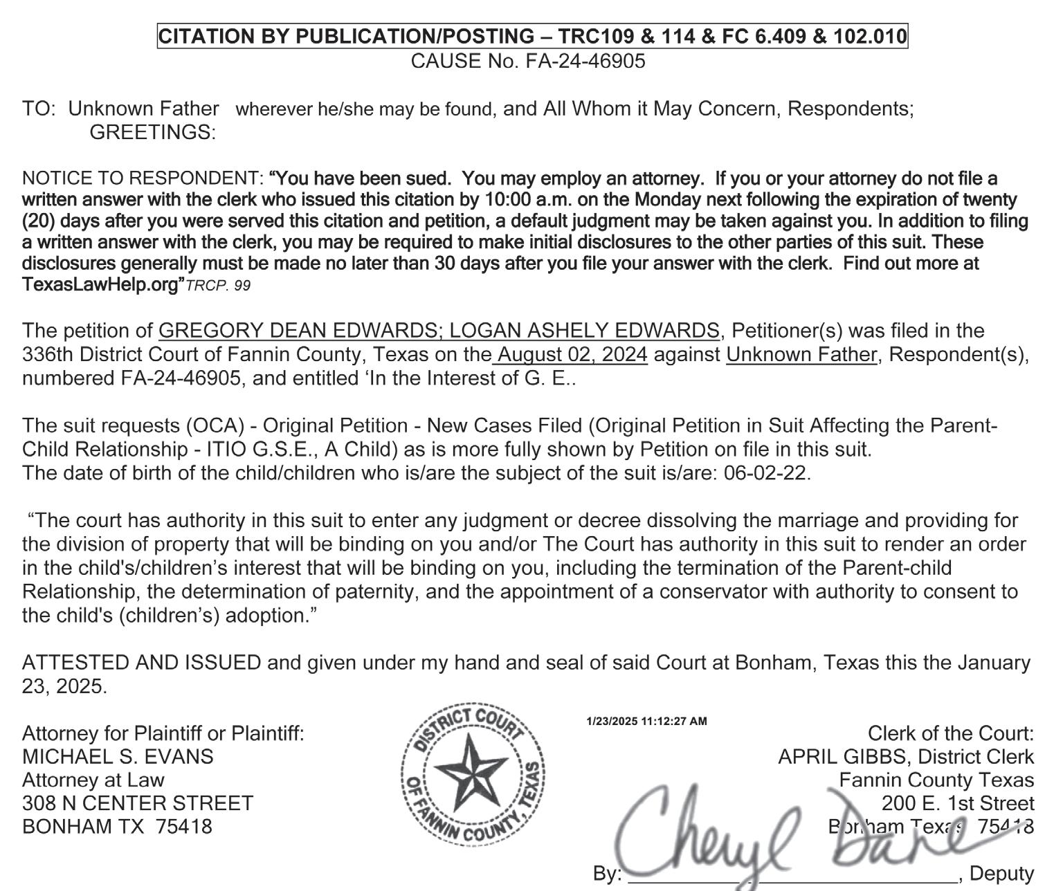 c/o: Michael S. Evans 308 North Center Street Bonham, Texas 75418