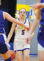 Dodd City’s Addyson Chaney (5) considers to whom to pass as she faces Ector’s defense on Jan 17.