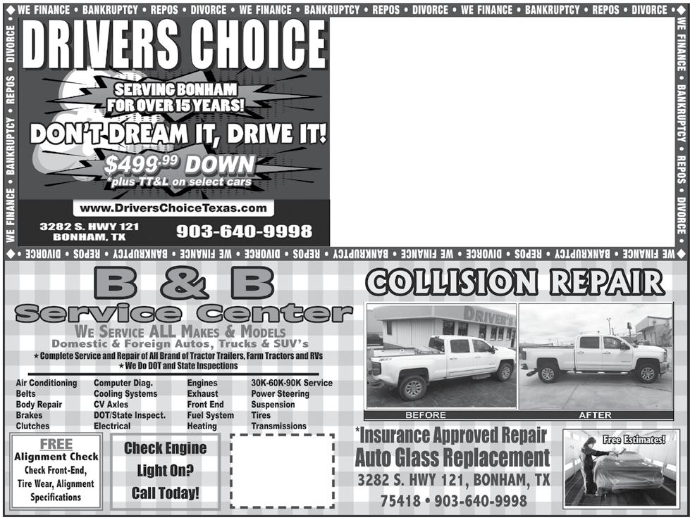 or email: andyweeks21@gmail.com Website: weeksfamilybeef.com 6/15/21 LANDSCAPE SERVICES Bonham, TX Residential & Commercial References Upon Request • Custom Flagstone Patios, Sidewalks, • Specialize in Flower Bed Cleaning • Pressure Washing • Retaining Walls • Tree Service and Removal • Fence Clearing • New Sod Installation • Firepits 903-421-1750 Free Estimates For The Best In Designing and Cleaning Flower Beds Call 12/14/21 • Weekly Pick-Up • Dependable Service • Serving All Of Fannin County • Locally Owned - Barry & Kim Williams Office • 903-583-3610 countytrashservicetx.com 2 Yard Dumpster $70.00 4 Yard Dumpster $105.00 Regular Service $26.00 / Month with 1 cart provided COUNTYTRASH SERVICE IF THE BOOT FITS, REPAIR IT! Don’t Toss Away A Perfectly Good Pair Of Boots or Shoes Simply Because They Are Showing A Little Wear and Tear. • Full or Half Sole • Ladies High Heels or Flats • Refinishing • Boot Repair RISK SHOE STORE & REPAIR SINCE 1921 102 S. Crockett • Sherman, TX West Side of Square Downtown Sherman 903-892-2238 SINCE 1921 www.riskshoestore.com 6/9/20 WISE FUNERAL HOME AFFORDABLE Traditional Services and Merchandise Alternative Celebrations of Life Direct Gravesides Cremation Services MONUMENTS FREE Planning Guide Easy Transfer of Your Pre-Paid Plans if you are new to our area or have plans from another funeral home and would like to use our services. Wise Funeral Home ChapelandCremationServices 219 W. Sam Rayburn Dr., Bonham, Texas 75418 (903) 583-2161 • www.wisefuneralhome.com Est. 1908 Tour our historic home built in 1897 The Murden Family and our experienced caring staff serving your family and your traditions “Be remembered and honored the way YOU want to be!” $ $ $ $ $ $ $ $ $ $ $ $ $ $ $ $ $ $ $ $ $ $ $ $ $ $ $ $ $ $ $ $ $ $ $ $ $ $ $ $ $ $ $ $ $ $ $ $ $ $ $ $ $ $ $ $ $ $ $ $ $ $ $ $ $ $ Whitlock’s Pawn & JewelryWhereWeActuallyDOLoanMore!!! GUARANTEED HIGHEST PRICES FOR YOUR GOLD!! Proud to Serve the Bonham Area for Over 26 Years “If We Don’t Have It Or Can’t Get It, You Don’t Need It” 509 N. Main Street • Bonham, TX 903-583-8114 Fast&Friendly Loans! DVD’s Buy One Get One FREE 5/17/16 4/7/15