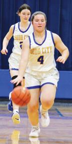 Dodd City’s Brianna Rodriguez (4) brings the ball up court as teammate Taegan Williams follows on Jan. 17.