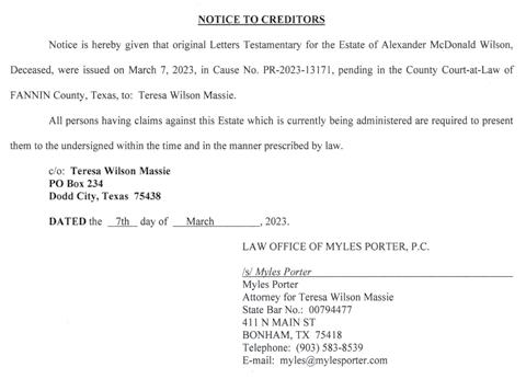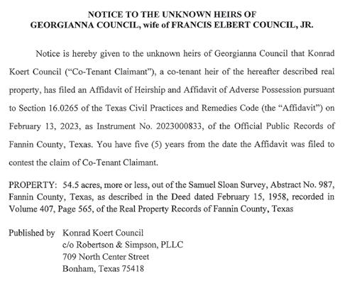 Notice is hereby given that the Fannin County Commissioners Court will hold a Public Hearing at 8:50 am on April 18, 2023 in the County Courthouse located at 101 E. Sam Rayburn Drive, Bonham, Texas. The public is invited to make comments concerning the proposal to partially close: