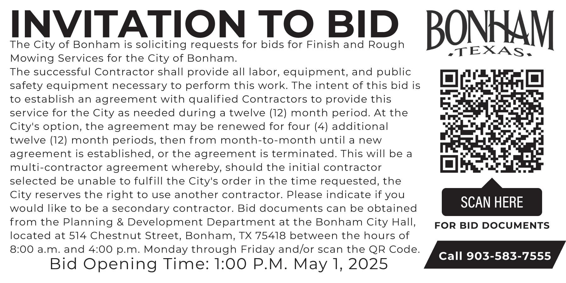 Sealed proposals must be filed in the County Purchasing Agent Office before 3 p.m., May 13, 2025, or said proposals will not be considered. Proposals shall be opened on May 13, 2025 at 3:30 p.m. in the Fannin County Purchasing Agent’s Office, 101 E. Sam Rayburn Dr. Suite 313, Bonham, TX 75418.