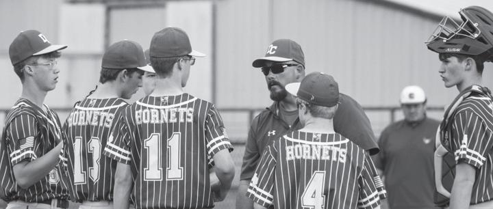 Dodd City manager Clint Lindsey meets on March 13 with the Hornets' infielders and battery -- (L to R) Caysen Lappin (5), Gavin Shindler (13), Maddox Lappin (11 Kaleb Covington (4) and Brody Lappin -- during District 11-2A baseball at Ector. This baseball postseason advance equals the 15th consecutive for Dodd City.
