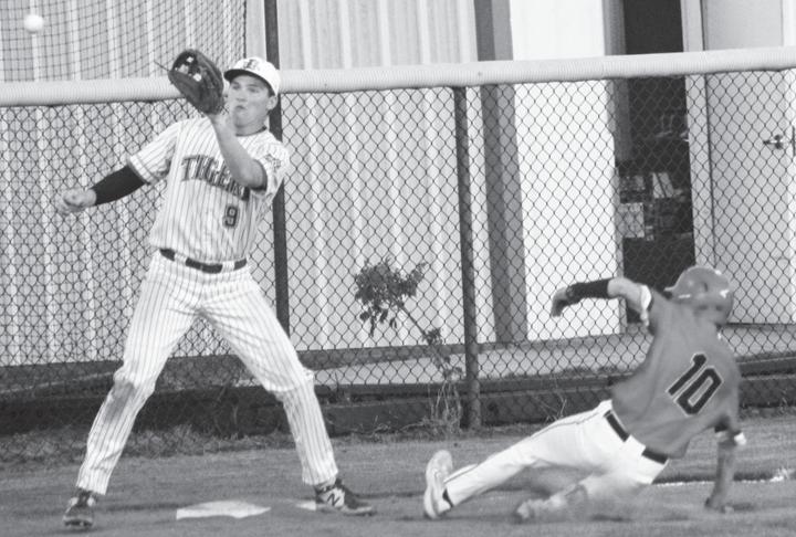 Leonard third baseman Bryson Bush (9) awaits a throw at and S&S's Brandon Petty (10) slides towards third base on April 11 during District 11-3A baseball at Leonard.