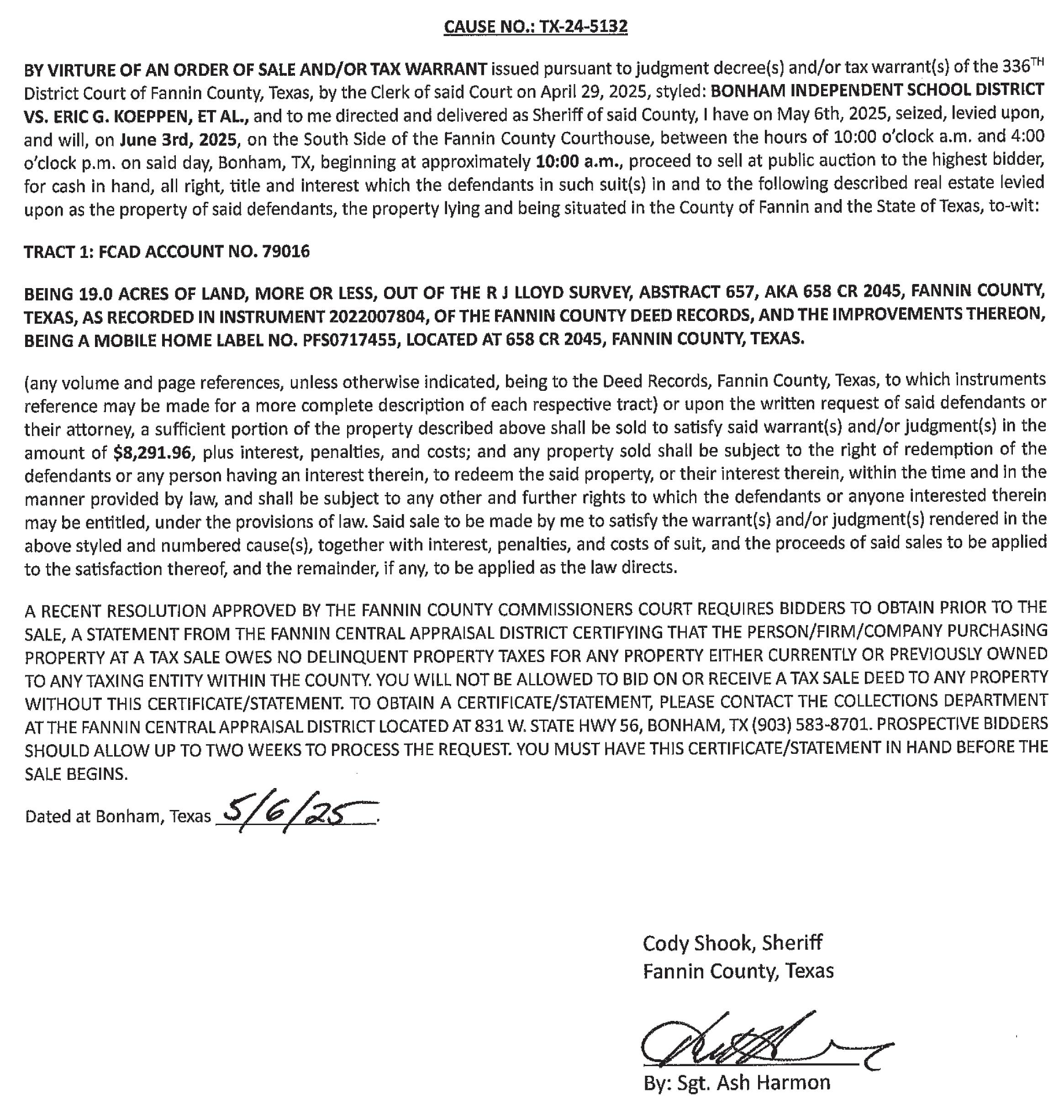 sale of County property –County Judge for Angel Titsworth, Weichert Realtors. This agenda item was passed by Commissioners Court. The remaining properties owned by the County remaining in the City of Bonham were deemed as “slim pickings,” very small lots with low value.