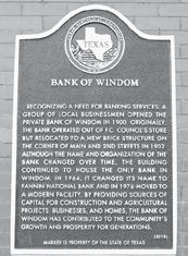 Marker Text: Recognizing a need for banking services, a group of local businessmen opened the private Bank of Windom in 1900. Originally, the bank operated out of F. C. Council’s store but relocated to a new brick structure on the corner of Main and 2nd streets in 1902. Although the name of the organization of the bank changed over time, the building continued to house the only bank in Windom. In 1964, it changed its name to Fannin National Bank and in 1976 moved to a modern facility. By providing sources of capital of construction and agricultural projects, businesses, and homes, the Bank of Windom has contributed to the Community’s growth and prosperity for generations.
