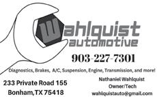 Page 6 • June 11, 2024 • 903-583-3280 6/11/24 Windom Feed Sack Casual Dining And Buffet 414 Main St. • Windom, TX 903-623-3013 Famous Fish & Seafood Buffet HomeBuffetCooking • 10 minutes from Bonham • Food ready when you get here! HOME COOKING BUFFET WEDNESDAY - SUNDAY 11:00 AM - 2:00 PM FAMOUS FISH FRY FRIDAY & SATURDAY 4:00 PM - 8:00 PM Serving Steaks while they last on Father’s Day! 7/3/18 Town West Coin Laundry 1204 Silo Road Bonham, TX 75418 Hours 7am - 10pm townwestlaundry@gmail.com 903.640.4864 office 6/11/24 4 Washer Sizes • Double • Triple • 4-Load • 6-Load 2 Dryer Sizes + Extra Large for comforters BLAIR’S AUTO REPAIR State Inspections Minor - Major Auto Repair 1312 E. Main St. Honey Grove, TX 903-378-2304 •A/C Repair •Flats Fixed •Tires 02-07-17 10/3/23 www.fanninpregnancy.org HOURS: Tuesday 9 AM - 7 PM Thursday 9 AM - 7 PM Saturday 9 AM - 1 PM 903-640-8230 FREE Pregnancy Test • FREE Sonogram Parenting Classes • Prenatal Classes 10/9/12 OFFICE LIZ CAGLE Office Manager CLAY SANDERS Customer Service DRIVERS BOBBY GERDES IRA HENDERSON MIKE PIERCE HWY 82 EAST P.O. BOX 1597 SHERMAN, TX 75091 OFFICE (903) 892-8933 TX WATS (800) 848-0251 Mgr. B.B. REEDY, JR. Cross Tax & Bookkeeping 9/12/23 Income Tax Service 2501 North Center St. Bonham, TX 75418 Office: 903.583.3903 Fax: 903.583.5142 crosstaxandbookkeeping@gmail.com Kim Cross formerly Norwood Bookkeeping Disaster Loan Applications & Deadlines Provided by US Small Business Administration