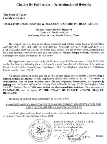 Sealed bids must be filed in the County Purchasing Agent Office before 3 p.m., June 20, 2024, or said bids will not be considered. Bids shall be opened on June 20, 2024 at 3:15 p.m. in the Fannin County Purchasing Agent’s Office, 101 E. Sam Rayburn Dr. Suite 313, Bonham, TX 75418.