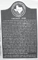 Marker Text: Named for David Crockett (1786-1836), the colorful Tennessee pioneer and congressman who rallied to cause of Texas in her war for Independence. Late in 1835, Crockett traveled by riverboat, horseback, and on foot, entering Texas along the Red River (NE of here). Camping at a site half a mile northeast of this park, he found wild bees and honey in hollow trees. In letters to family and friends, Crockett called the campsite a “Honey Grove.” It is said he told his friends he would settle here later, but in a few weeks he died in cause of freedom at the Alamo.