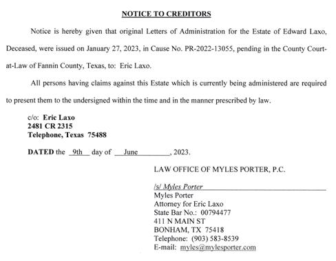 Sealed bids must be filed in the County Auditor’s Office before 2:30p.m., June 30, 2023 or said bids will not be considered. Bids shall be opened on June 30, 2023 at 2:30p.m. in the Fannin County Auditor’s office, 101 E. Sam Rayburn Dr. Suite 301, Bonham, TX 75418.