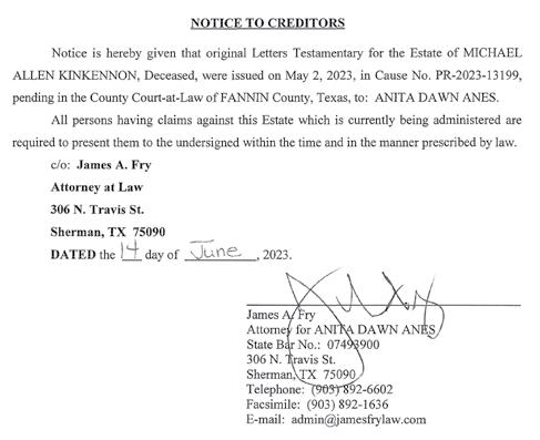 Sealed bids must be filed in the County Auditor’s Office before 4 p.m., June 30, 2023 or said bids will not be considered. Bids shall be opened on June 30, 2023 at 4 p.m. in the Fannin County Auditor’s office, 101 E. Sam Rayburn Dr. Suite 301, Bonham, TX 75418. Fannin County Commissioners Court reserves the right to reject any and all bids.