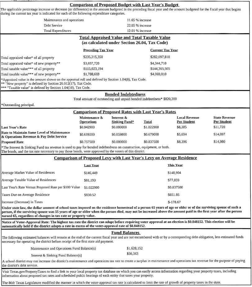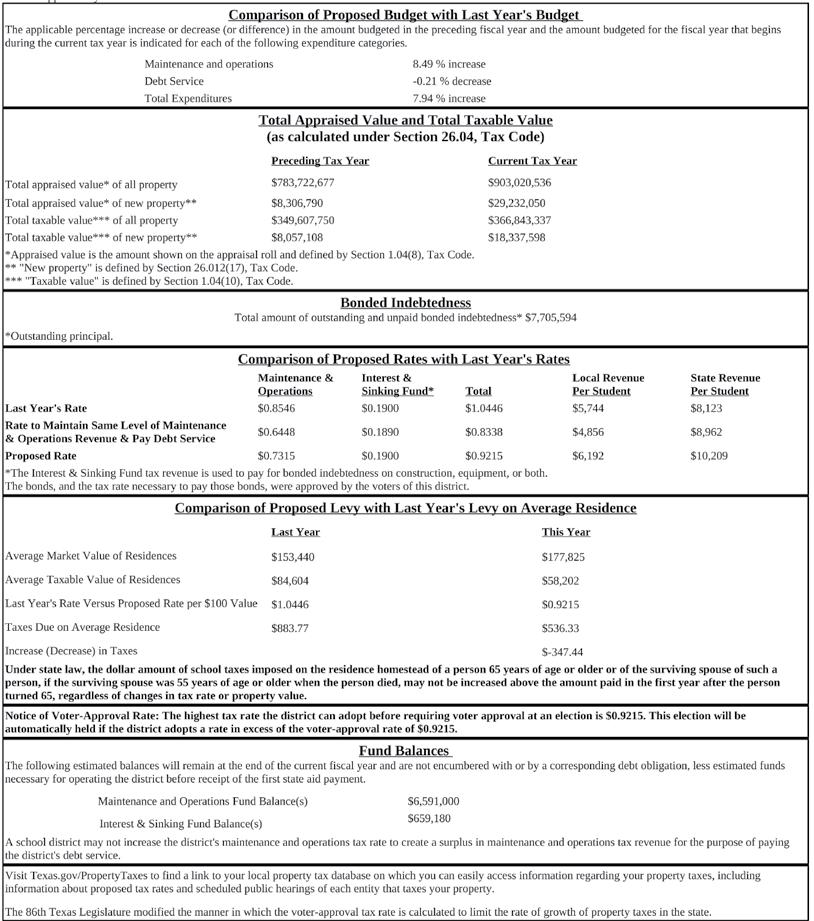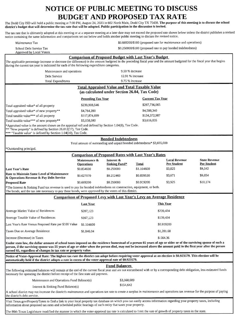 This proposed budget will raise more revenue from property taxes than last year’s budget by an amount of $119,675.25 which is a 3.5% increase from last year’s budget. The property tax revenue to be raised from new property added to the tax roll this year is $689,418.51. (The 2022 tax rate was 0.435213 and the 2023 proposed tax rate is 0.400719.)