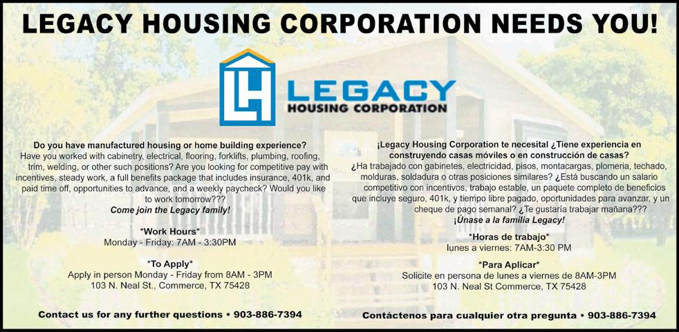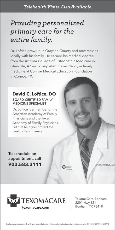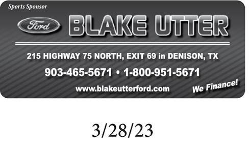 Page 28 • August 8, 2023 • 903-583-3280 - Walk-ins Welcome - Family (Adult & Children) Dentistry - Extraction including Wisdom teeth removal - Implants - Crowns & Bridges - Root Canals including Molar Root Canal - Dentures including immediate dentures, implant support dentures, flexible denture, etc. - Teeth Whitening - Nitrous Oxide sedation, etc. - All Dental Emergency Services 1400 N Center St. Suite 100 Bonham, Texas OFFICE HOURS: 9:00am - 6:00pm (M-F), 9:00am - 2:00pm (Alternate Saturdays) 903-304-5808 www.horatiodental.com greatsmile@horatiodental.com FOSSIL RIDGE Roofing and Construction 903.624.4900 fossilridgeroofing.com A Rated BBB - Licensed and bonded in Oklahoma and Texas • Composition Roofs • Metal Roofs • Remodeling / Construction • Gutters • Windows • Free Inspection • Claim Specialist LEVEL LOOP CARPET (Example) 12’x12’ Room = $111.84+TAX PLUSH CARPET (Example) 12’x12’ Bedroom = $127.84+TAX CERAMIC TILE (Example) 12’x12’ Kitchen = $142.56+TAX WE HAVE IT ALL! BRING YOUR TRUCK & TRAILER! PRICES ARE CASH & CARRY LARGEST FLOORINGINVENTORY! In NE Texas & SE Oklahoma THOUSANDS OF FEET OF VINYL PLANK, TILE & CARPET! 2115 N.E. LOOP 286 • PARIS, TX • 903-785-8317 File Name: CarpetWorld022118 4x5-25.indd Date Created: 01/19/15 Date Modi ed: February 19, 2018 1:33 PM 55 Years of Service! 10/2/18 FOR THE BEST DEALS STOP BY TODAY! OPEN M-F 8AM - 5PM 1/28/20 99¢sq. ft. $799sq. yd. sq. yd. 2/1/22 $899 2/15/22 Ronnie L. Lester Broker - Associate Licensed in TX & OK Cell: 903-782-2524 BONHAM LAND & RANCHES, LLC 2524 N. Center St. Bonham, TX 75418-2114 e-mail: ron_lester@realtyagent.com 8/30/22 New Units Now Available Safe, Secure Storage 8280 W. Hwy 56 Savoy, TX 75479 903-449-4480 hwy56storageranch.com 1/17/23 Shawana O’Neal Cell: 903-819-5035 soneal@fathomrealty.com shawanaoneal.fathomrealty.com REALTOR Are you thinking about selling and want to know what your home is worth? I can help! Bee Kind! Bonham Animal Shelter needs donations to finish their add-on space. For the add-on to be finished they need electricity, heating/ ac, insulation, plumbing, fencing. Paid employees and volunteers work hard for these animals and more space is needed. If you are able donate toward finishing this project, that would be great! Send donations to: Bonham Animal Shelter, 500 Industrial St, Bonham, TX 75418. Open: Monday thru Friday. 8am-4pm. Phone: 903-640-8245 Email: bonhamanimalshelter500@gmail.com Bonham Animal Shelter Call or Text 911 for Emergency Help Cooke, Fannin & Grayson Counties Courage is Fear that has said it’s Prayers.