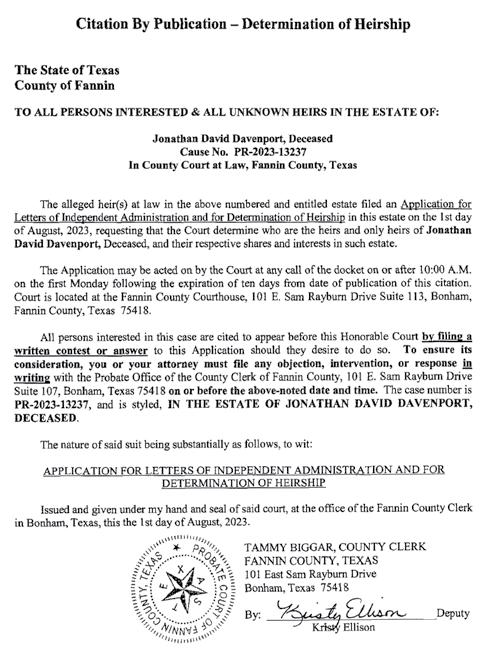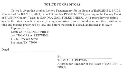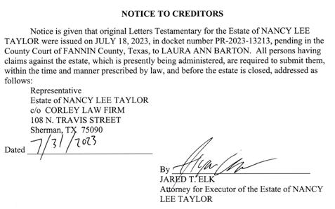 Notice is hereby given that on August 21, 2023 at 8:30 a.m. in the Fannin County Courthouse, 101 E. Sam Rayburn Dr., Bonham, Fannin County, Texas; the Commissioners’ Court of Fannin County, Texas will conduct a public hearing for the purpose of discussion regarding the 2023-2024 Proposed Fannin County Budget per Texas LGC 111.007. A copy of the 2023-2024 Proposed Budget is available on the County website: www.co.fannin.tx.us or at the County Auditor’s Office (101 E. Sam Rayburn Dr., Suite 301, Bonham, TX). A vote to adopt the budget will be held on August 21, 2023 at 9:00 am at the Regular Meeting of the Fannin County Commissioners Court at the Fannin County Courthouse.