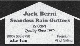 Page 27 • August 8, 2023 • 903-583-3280 3-26-19 JOSE VAZQUEZ Lawn Maintenance, Landscaping, Tree Trimming, Brush Clearing, Fencing, Pipe Fence, Gutters/Drainage, House Painting, Power Washing, Firewood and more! Ph: 903-227-5898 farmandlawn78@gmail.com 8403 N. State Hwy 78 Ravenna, TX 75476 Ph: 903-583-1259 4-16-19 www.guardiangaragedoor.com GUARDIAN GARAGE DOORS Repair • Service • Installation VETERAN OWNED & OPERATED 903.274.2414 1613 N. Center St. • 903-583-9196 Oil Change • State Inspection • Tire Repair FREE ICE CREAM 1/26/21 Services LLC Property Improvements Johnny Horton • 940-704-7760 LOCALLY VETERAN OWNED U.S. AIR FORCE 21 YEARS Skid Steer Operations Demolition & Site Clean-Up Dumpster Services Auger & Trencher Work Tractor Mowing (Large & Small Acreage) Payment Plan Options J C 5/31/22 Millers Garage 903-486-6223 All makes and models Gas and diesel Mon - Fri: 8am to 5pm 405 Katy Blvd Bonham Texas 75418 Call for appointment 407 E. Sam Rayburn Dr. Bonham, TX 75418 903-449-4341 bonhamcustommemorials@gmail.com netxmonuments.com Like Us On Facebook 9/6/22 Danny Davidson 903-227-1625 HANDYMAN Anything on your Honey-Do List your Honey won’t do? Call ME!! Bathrooms Flooring Trim Work Remodel Much More... 9/6/22 Justin Miller Office: 903-583-7867 10/4/22 BILL GEORGE CUSTOM METAL BUILDINGS We build: Shops, Barns, Custom Metal Buildings, Pole/Hay Barns, Barndo’s, Metal Houses, Fences, Entry-ways all types of custom metal work. Call us for a free estimate today! Bill George 903-583-0298 11/15/22 9035831137 11/22/22 We love our Veterans and Seniors. Ask about our discount! 40 Years Experience Master Plumber, LLC David Phemister M37363 VETERANS PLUMBING 1/3/23 JOHN KINMAN FENCES 47 Years Still Practicing John Kinman Ph.D. Post Hole Digger 903-965-4251 51 Years Still Practicing CHAIN LINK • WOOD • WROUGHT IRON • PIPE • VINYL • REPAIRS John Kinman Fences (903) 583 - 0418 • 1521 N Hwy 121 Bonham, TX • Authorized Repair Facility 1/24/23 We Service All Equipment! 3/7/23 BONHAM STICKS AND STONES 1500 E. U.S. HWY 82, BONHAM (East of Bonham) LANDSCAPING STONES PEA GRAVEL COMPOST SAND QUALITY HAY FOR SALE bonhamsticksandstones.com 903-640-3686 903-814-3738 3/28/23 Nash Enterprises Joel Nash / Owner New Construction and Remodeling & Roll-Off Dumpsters joelnash677@yahoo.com (903)456-3783 PO Box 103 Dodd City, TX 75438 www.nashenterprises.org 3/21/23 Mobile HoMe ServiceS DeckS Skirting FloorS batHS Painting leveling rooFS QualiFieD FHa concrete runner • • • • • • • • 903-640-6999 • texaS one call DoeS it all! electric & Water lineS Call The Professionals! 469-226-3265 903-505-0725 7/18/23 WE CAN GET ANY MATERIAL YOU NEED SO GIVE US A CALL FOR A FREE ESTIMATE Family Owned & Operated - God Bless Hauling: Rock • Dirt Sand • Asphalt Crushed Granite Excavation Work: Driveways Ponds House Pads Leveling Land Road Base Skidsteer Work 8/01/23 Residential Commercial Scott Dobbels New Construction / Emergency Repairs Or Anything In Between! License# M-39756 Phone# 903-486-6977 Poor Dad’s BBQ Catering & By The Pound 903-227-2386 23 Years Experience 1/10/23 spec Poor Dad’s BBQ Catering & By The Pound 903-227-2386 23 Years Experience 8/8/23 We Do New Construction Residential Plumbing Plumbing Tek M-40891 Kitchen/Lab Faucets, Shower Trims, Toilet Change Outs, Tubs, Water Heaters, Tankless Installs, Plumbing Repairs FREE ESTIMATES! Remodeling & General Contractor LLC 469-256-1763 469-200-9890