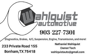 Page 2 • August 8, 2023 • 903-583-3280 E-EDITION ONLINE @ WWW.FANNINCOUNTYLEADER.INFO BINDERY Tx. as covering info@nationwidebinding.com BIBLE and BOOK REPAIR at the BINDERY STOP by For A Free Quote! All work completed @ 1003 N. Center St., Bonham, TX 903-583-3255 Email: info@nationwidebinding.com WE REBIND BIBLES AND OTHER BOOKS! 4/4/23 LITTLE CHIEF PEST CONTROL Complete Pest Control Phone: 903-893-7602 Mobile: 903-718-0509 Termite Treatment Termite Inspection Charlie N. Bell, Jr. P.O. Box 2849 Sherman, TX email:littlechiefpc@yahoo.com Speedy Locksmith (903) 868 - 2068 ● Commercial ● Residential ● Auto ● Keys Made By Code ● Car Computer Chip Keys ● Safes Opened & Installed ● Burglar Bars Installed ● Police-Approved Deadbolts TX Lic #B12951 OK Lic #1142 Licensed & Insured Reasonable Rates! 11/22/22 Meade-Norman & Bayless Insurance Agency www.bayless-hall.com 110 W. 5th St. P.O. Box 519 Bonham, Texas 75418 Phone 903-583-2231 Fax 903-583-9497 7/11/23 All Makes and Models Quality Service 903 - 505 - 8352 1348 FM 1552 Leonard, TX 903 - 441 - 3288 Open Mon - Fri: 8 - 4 ||| Sat: 8 - 12 The Garage on 1552 wildwestelectricllc.com 7/18/23 Damon Wilder Owner/Master Electrician TECL #36038 / ME #531118 Residential/Commercial 903-227-9608 •Air Conditioning & Heating Services • Mini Split Installation & Services • Residential Electric • Home Repair & Remodel • Plumbing Aesthetics • Handyman Task FREE ESTIMATES 8/1/23 *Top-Quality Bow Sales and Repairs *Amazing Archery Accessories *Lifetime Warranty on All New Bows 903-737-8595 ● 54 CR 42320 Paris, TX 75462 Make every hunt the hunt of your lifetime! 7/4/23 Tony@budgetwindowsoftexoma.com 100 John F Kennedy Dr. Bonham Tx 75418 903-640-6190 Freshaestheticsbarbershop.com Stylist Now Available!