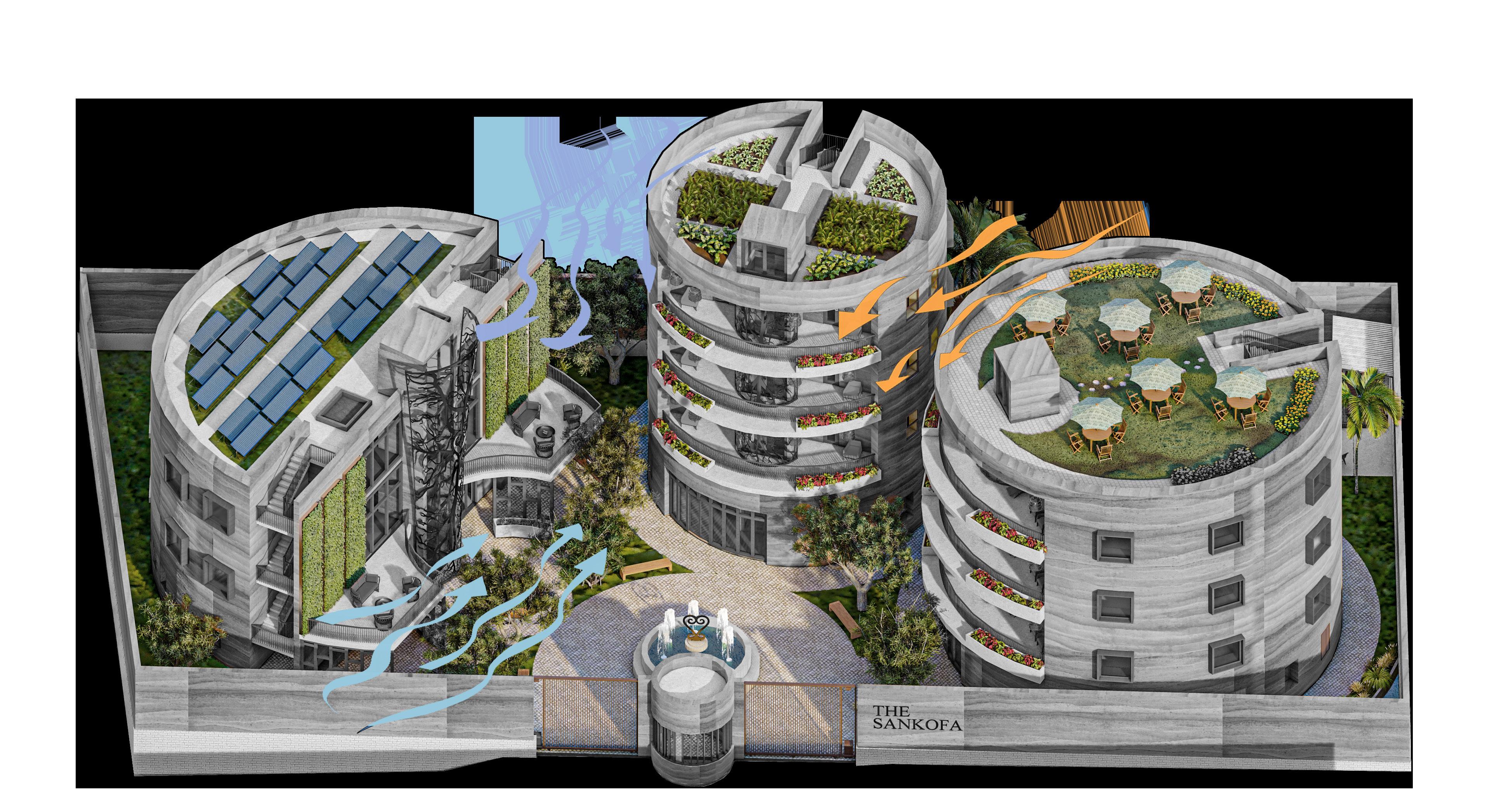“The Sankofa” is responding to the call for an architectural language that reconnects repatriates, returning to Ghana to commemorate the year of return to their ancestral homeland. By embracing the roots of Ghanian heritage while also creating a sense of familarity for expats travelling from America to Ghana, this design explores the form and meaning behind the Baobab tree and the Sacred Adinkra symbol of Sankofa.