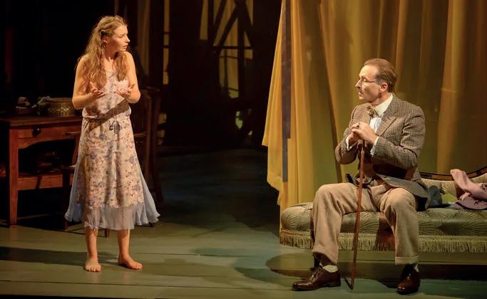 A redemption of this failed feminine centre occurs through the character of Lucia Joyce (Genevieve Hulme Beaman), who embodies the distorted legacy of her father’s artistic genius. Although parts of the play are structured through memories which Nora (Bríd Ní Neachtain) recounts to a seamstress named Brigitte (Hilda Fay), Lucia repeatedly returns to demand the attention of characters and audience alike through her arduous attempts to close the gap with her father and coexist with her mother. This latter endeavor proves impossible over the course of the play, but Lucia’s relationship with her father becomes a turning point of Joyce’s Women: a site of intoxicating closeness and biting betrayal.