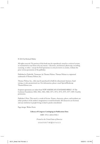 © 2013 by Richard Mabry All rights reserved. No portion of this book may be reproduced, stored in a retrieval system, or transmitted in any form or by any means—electronic, mechanical, photocopy, recording, scanning, or other—except for brief quotations in critical reviews or articles, without the prior written permission of the publisher. Published in Nashville, Tennessee, by Thomas Nelson. Thomas Nelson is a registered trademark of Thomas Nelson, Inc. Thomas Nelson, Inc., titles may be purchased in bulk for educational, business, fundraising, or sales promotional use. For information, please e-mail SpecialMarkets@ ThomasNelson.com. Scripture quotations are taken from NEW AMERICAN STANDARD BIBLE®, © The Lockman Foundation 1960, 1962, 1963, 1968, 1971, 1972, 1973, 1975, 1977, 1995. Used by permission. Publisher’s Note: This novel is a work of fiction. Names, characters, places, and incidents are either products of the author’s imagination or used fictitiously. All characters are fictional, and any similarity to people living or dead is purely coincidental. Page design: Walter Petrie Library of Congress Cataloging-in-Publication Data ISBN 978-1-4016-8708-3 Printed in the United States of America 13 14 15 16 17 18 QG 6 5 4 3 2 1
