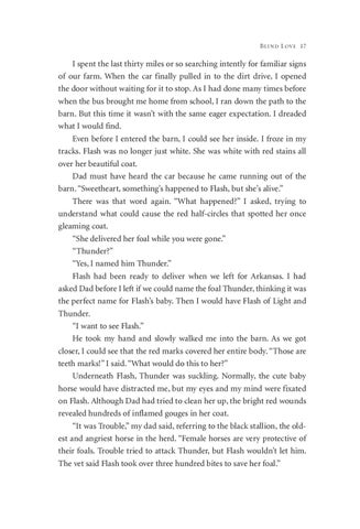 I spent the last thirty miles or so searching intently for familiar signs of our farm. When the car finally pulled in to the dirt drive, I opened the door without waiting for it to stop. As I had done many times before when the bus brought me home from school, I ran down the path to the barn. But this time it wasn’t with the same eager expectation. I dreaded what I would find. Even before I entered the barn, I could see her inside. I froze in my tracks. Flash was no longer just white. She was white with red stains all over her beautiful coat. Dad must have heard the car because he came running out of the barn. “Sweetheart, something’s happened to Flash, but she’s alive.” There was that word again. “What happened?” I asked, trying to understand what could cause the red half-circles that spotted her once gleaming coat. “She delivered her foal while you were gone.” “Thunder?” “Yes, I named him Thunder.” Flash had been ready to deliver when we left for Arkansas. I had asked Dad before I left if we could name the foal Thunder, thinking it was the perfect name for Flash’s baby. Then I would have Flash of Light and Thunder. “I want to see Flash.” He took my hand and slowly walked me into the barn. As we got closer, I could see that the red marks covered her entire body. “Those are teeth marks!” I said. “What would do this to her?” Underneath Flash, Thunder was suckling. Normally, the cute baby horse would have distracted me, but my eyes and my mind were fixated on Flash. Although Dad had tried to clean her up, the bright red wounds revealed hundreds of inflamed gouges in her coat. “It was Trouble,” my dad said, referring to the black stallion, the oldest and angriest horse in the herd. “Female horses are very protective of their foals. Trouble tried to attack Thunder, but Flash wouldn’t let him. The vet said Flash took over three hundred bites to save her foal.”