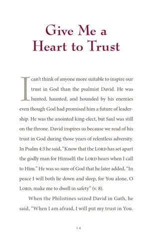 even though God had promised him a future of leadership. He was the anointed king-elect, but Saul was still on the throne. David inspires us because we read of his trust in God during those years of relentless adversity. In Psalm 4:3 he said, “Know that the Lord has set apart the godly man for Himself; the Lord hears when I call to Him.” He was so sure of God that he later added, “In peace I will both lie down and sleep, for You alone, O Lord, make me to dwell in safety” (v. 8). When the Philistines seized David in Gath, he said, “When I am afraid, I will put my trust in You.