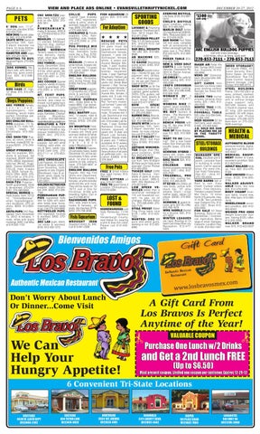 PETS 6' DOG pen, 11’x7', chain link, one door, $150, 812-453-7533 NEW DOG Kennel, plastic, $40. 812-476-9199. SKATE WITH Santa on December 15th, 1pm3:30pm! Swonder Ice Arena for more information call 812-436-5717 HAMSTER AND cage, $25, 812-491-0624. WANTING TO BUY: Weaned Piglets. 270-9298630. DOG KENNEL Medium size, with removable tray, good condition, $35. 812-5984464.