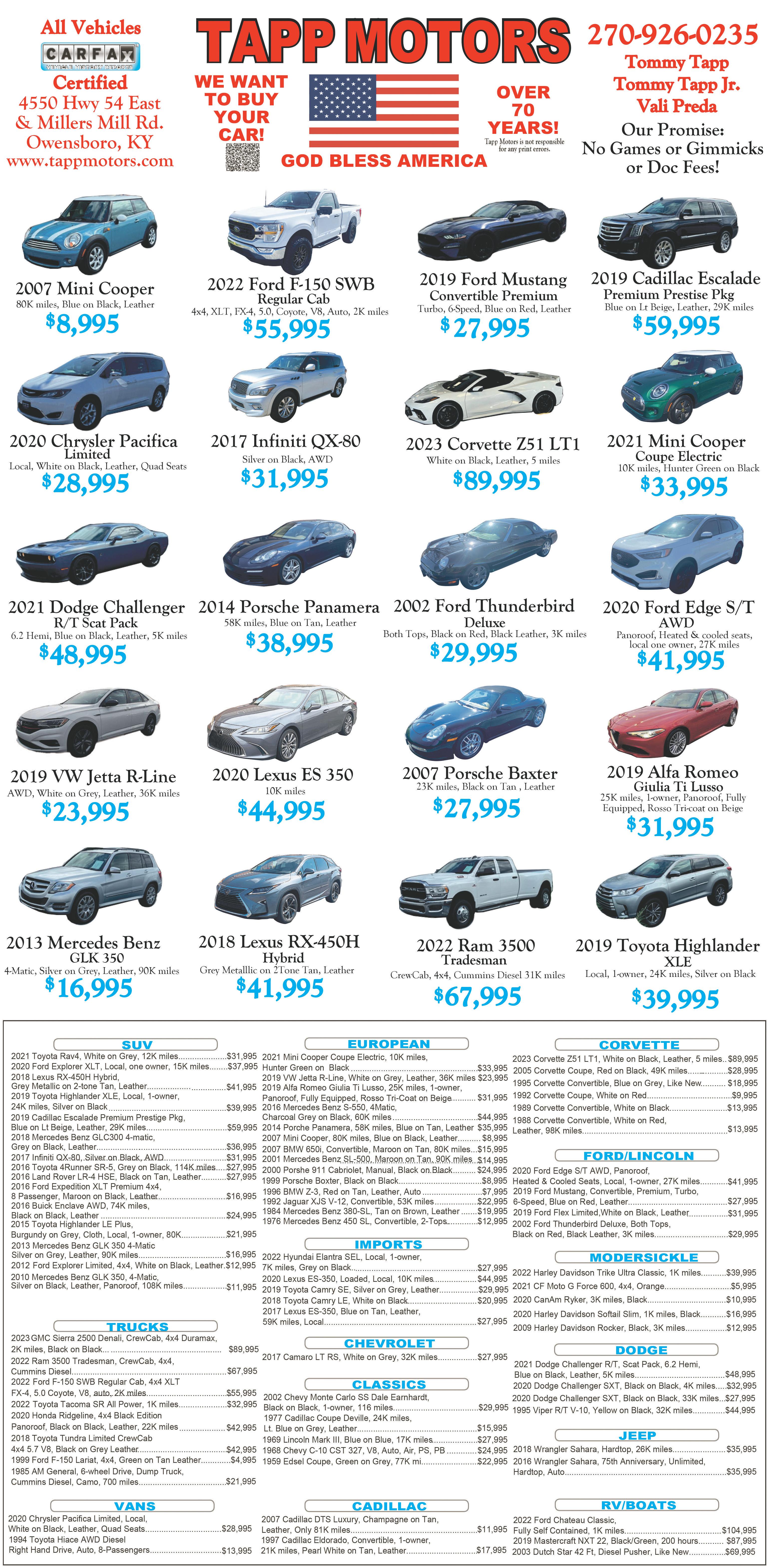 ATTENTION I BUY CAMPERS, TRAILERS, & MOTOR HOMES- ALL TYPES, ready to go or need work. For FAST CASH Call Lawrence at 931-242-3135 CARS WANTED Paying top dollar for your non-running, wrecked, or damaged vehicle. For more details. Call me at 812-549-6267. JKV’S CORE BUYING & Automotive Recycling. Buying junk vehicles, scrap metal, & all non-ferrious items. M-F 8-4, Sat. 8-11:30. Free Pick Up. Covering Kentucky & Indiana. Best Price Guaranteed. 270-231-6819 or Yard # 270-593-7029. 355 W. 4th St., Sacramento, KY. MATTINGLY’S AUTOMOTIVE REPAIR, 2405 Veach Rd., Owensboro. Jasper engines & transmissions, alignment, brakes, tune-ups. 270-6834251 or 270-684-0719. A BUYER of OLD CARS CLASSIC & ANTIQUE: 1930’s, 40’s, 50’s, 60’s, & 70’s. Running or Not. Call 513-403-7386 $CASH NOW$ We buy trucks and cars any condition. Running or not, junkers OK. FREE towing. 812-897-5318, 812-4554503. 812-897-5319 - 24 hour fax line $TOYOTA TRUCKS$ Wanted to buy Toyota trucks, 4wd or regular that need repair. Any condition ok. Also buying motors, transmission, truck beds, stock rims, bodies, etc. Parts of any kind for Toyota trucks. 812-897-5318, 812455-4503. 812-897-531924 hour fax line B B U U II C C K K BUICK 2017 LaCrosse Essence, leather, sunroof, $359/month. 812-421-8861 BUYING CARS & scrap. We pick up cars too. Call 270-6842391, D-N-J Auto Parts, 7100 Hwy. 81, Owensboro. C C A A D D II L L L L A A C C CADILLAC 2012 CTS Premium, 114k, $11,450. 812402-4662 C C H H E E V V R R O O L L E E T T CHEVROLET 2006 Corvette Convertible, 44k, $26,995. 270926-4702. CHEVROLET 2008 Malibu, under $10,000. Call Tina Howard 270-315-0189. CHEVROLET 2013 Impala, 270-240-4185. CHEVROLET 2013 Malibu LS, 4-door, blue, $14,500. Will take trades, Financing available, 270-213-0284 CHEVROLET 2013 Malibu LS, 98k, $339/month. 812-4218861 CHEVROLET 2014 Impala LT, sunroof, $85/week. 812-4218861 CHEVROLET 2015 Cruze LS, 270-215-6106. CHEVROLET 2015 Malibu LT, 31k, $339/month. 812-4218861 CHEVROLET 2016 Cruze Limited, loaded, $9,900. 270826-7900. CHEVROLET 2016 Cruze Limited LT, 69k, FWD, $14,900. Will take trades, Financing available, 270-213-0284 CHEVROLET 2017 Cruze Premier, 270-215-6106. CHEVROLET 2019 Malibu LT, 270-215-6106. CHEVROLET 2019 Malibu LT, FWD, $19,900. Will take trades, Financing available, 270-213-0284 C C H H R R Y Y S S L L E E R R CHRYSLER 2012 200, power windows & locks, 270-6919393. CHRYSLER 2015 200 C, leather, loaded, $10,900. 270826-7900. CHRYSLER 2016 200, $10,990. 270-685-1638. SEVERAL CARS , SUV’s, Vans under $7,000. Financing Available. 270-213-0284. Page 6 SEE OUR DIGITALEDITION WWW.TRISTATETHRIFTYNICKEL.COM March 30, 2023 WE RENT BUY HERE PAY HERE WEEKLY•BI-WEEKLY & MONTHLY PAYMENTS AVAILABLE Lift kits, wheels, tires 1307 W. 2nd St. Owensboro, KY 270-231-8155 1225 W. 2ND ST. OWENSBORO KY(270) 691- 9393 www.LanhamOffroad.com www.SpecialtyMotorsKy.com OVER 200 NEW & BLEM BATTERIES IN STOCK!! 15 FORD FUSION PW, PL, 14 FORD ESCAPE 4cyl., PW, PL 13 CHRYSLER T&C PW, PL 13 CHRYSLER 200 LX 4 cyl., PW 12 CHEVY CRUZ 4 cyl., PW, PL 12 CHEVY MALIBU PW, PL 11 FORD ESCAPE 4cyl., PW, PL 11 FORD FUSION PW, PL 10 DODGE JOURNEY PW, 3RD ROW 10 GRAND CARAVAN Stow N Go, 6 cyl 09 DODGE CALIBER PW, PL, 4 cyl. 09 MERCURY MARINER PW, PL 90 CHEVY CK-2500 Lift gate, flatbed, 2WD, $3,995 Cash plus TT&L 2009 CHEVY TAHOE LT, 5.3 V8, 4X4, DVD, Bose $1,000 Down/W.A.C. 2013 JEEP GRAND CHEROKEE V6, 4X4, loaded, 107K miles $13,995 2008 CADILLAC DTS 2nd owner, mint condition, 160K miles $6,995 2013 CHEVY CAPTIVA LTZ, FWD, roof, loaded $1,000 Down/W.A.C. 2005 GMC SIERRA 1500 Reg. Cab, 140K miles, 4X4 $9,995 THIS WEEKS SPECIAL 2006 CORVETTE CONV. auto, 6.0L V8, only 44K miles $26,995 2014 FORD F-150 X-CAB 2WD, V6, 110K miles $17,888 S 2018 HYUNDAI ELANTRA Local, 80K miles, 4 cyl. $14,995 2013 SILVERADO Z71 Crew Cab, 4X4, only 107K miles, loaded $22,995 2005 GMC SIERRA Reg. Cab, V6, 4X4, 140K miles $1,000 Down/W.A.C. AutoSales 2019 TOYOTA COROLLA SE Local, 33K miles, Sharp! $21,995 2015 CHEVY IMPALA Limited, 115 K miles, roof, loaded $11,995 2015 CHEVY COLORADO 4 cyl., 1 owner, X-Cab $15,995 2010 JEEP WRANGLER 4X4, V6, automatic $10,995 2018 GMC TERRAIN SLE, 4 cyl., local, AWD, 80K miles $20,995 2820 New Hartford Rd. • Owensboro, KY (270) 926-4702 2015 CHRYSLER 200 Local, 71K miles, Limited $14,995 THIS WEEKS SPECIAL Check Us Out on the Web at www.skillmansautosales.com SOLD SOLD SOLD SOLD killmans SOLD SOLD SOLD SOLD SOLD SOLD SOLD SOLD 2015 CHEVROLET Silverado 2500 Z71 LT, 4x4, double cab, white, excellent condition, $17,995. 270-925-5658 2019 GRAND DESIGN RV, Solitude model, 35’, (3) slides, (5) awnings, 5th wheel, washer/ dryer, (2) TV’s, 16-ply tires, JD Power $61,800, asking $57,500. 270-925-5658 REV CUSTOM WHEELS (4) 20”X10”, 8 Lug x 6.50” bolt circle dia., came off a 2005 Chevy 3/4 ton, $450. 812-204-4587