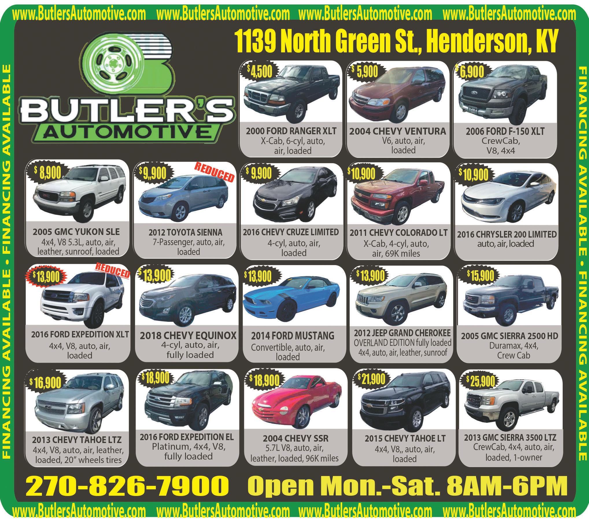 E R R CHRYSLER 2018 Pacifica, 120k. Call Tina Howard 270315-0189. D D O O D D G G E E DODGE 2010 Journey, 160k, $5995. 270-686-3456. DODGE 2010 Journey, power windows & locks, 3rd row, 270691-9393. DODGE 2016 Ram 1500, 4x4, 5.7 Hemi, grey, Mega cab, long bed, 98k miles, $15,000, or will trade for Ford or Ram, 812-629-6429 DODGE 2016 Ram 1500 ST, 5.7 Hemi, $15,990. 270-6851638. DODGE 2017 Durango SXT, $359/month. 812-421-8861 F F O O R R D D FORD 1998 F150 Super Cab 4x4, 4.6 V8, new tires, 144k, driven daily, $7,200. 270-6351322 FORD 2010 F150, 58k, Super Cab, $16,990. 270-685-1638. FORD 2010 F150 XLT, 123k, Super Crew Cab, $14,990. 270-685-1638. FORD 2011 Escape, power windows & locks, 270-6919393. FORD 2011 Explorer AWD, 3rd row, Nav., back-up camera, $8995. 270-686-3456. FORD 2011 F250 XLT 4x4, $15,900. 270-826-7900. FORD 2012 Escape Limited, leather, loaded, $7,990. 270685-1638. FORD 2013 Explorer, AWD, loaded with equipment, $13,990. 270-685-1638. FORD 2013 Explorer XLT, 3rd row, 115k, $14,995. 270-9264702. FORD 2014 Escape, power windows & locks, 270-6919393. FORD 2014 Escape Titanium, heated seats, rearview camera, $319/month. 812-421-8861 FORD 2014 Expedition GL Limited 4x4, loaded, $16,900. 270-826-7900. FORD 2015 Explorer XLT, 270-215-6106. FORD 2015 F150 Lariat, 270240-4365. FORD 2016 Expedition XLT, loaded, $15,900. 270-8267900. FORD 2018 F150 STX Super Cab, 117k, $21,950. 812-4024662 G G M M C C GMC 2009 Sierra SLT 1500 4x4, crew cab, loaded, $12,900. 270-826-7900. GMC 2012 Acadia, $9500. 812-423-9265. GMC 2012 Sierra SLT, 4x4, loaded, $28,900. 270-8267900. GMC 2013 Terrain SLT-1, FWD, $6995. 812-423-9265. GMC 2013 Yukon SLT, 4x4, $12,500. 812-423-9265. GMC 2015 Yukon Denali, 270240-4365. GMC 2016 Sierra, 270-2404365. GMC 2018 Terrain SLE, AWD, 80k, $20,995. 270-926-4702. J J E E E E P P JEEP 2010 Wrangler, 4x4, $10,995.