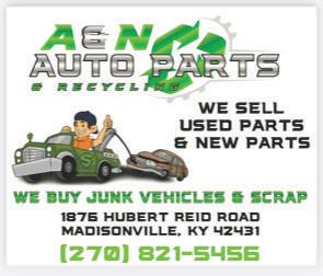 Sienna XLE, 123k, $14,950. 812-402-4662 17” FACTORY Aluminum Wheels off a 2009 Dodge truck, $200, 270-282-3110. (2) P245/70R17 Tires, $60. 270-399-1211 2005 MASTER Tow Dolly, excellent condition, $900, 270316-3794 COLD A/C in your vehicle? If not, we can help! Call Moore’s Auto Electric 270-240-1343. EZ AUTO SALES & PARTS, 1008 Omega St., Owensboro. We buy any cars, new aftermarket Parts, used parts, Tires. Auto repair available. 270-5411950. LIFT KITS , Wheels, Tires. Lanham Offroad Accessories, 270-231-8155. REV CUSTOM WHEELS (4) 20”X10”, 8 Lug x 6.50” bolt circle dia., came off a 2005 Chevy 3/4 ton, $450. 812-204-4587 16’ COLEMAN Canoe, excellent, Reduced to $325. 270925-5658. 16’ TRACKER Sportsman with trailer, 30hp Evinrude, footcontrolled trolling motor, 3 seats, excellent condition, $3,495. 270-925-5658. 2019 RV Grand Design, Solitude model, 35’, 3 slides, 5 awnings, 5th wheel, washer/ dryer, 2 TV’s, 16 ply tires, JD Power $61,800, asking $57,500. 270-925-5658. ★★★★ WANTED TO BUY RV’s, Motorhomes, Campers, Trailers of all types, Old School Buses, Golf Carts. Any condition OK. 812-4554503. POLARIS RANGER 1000, like new, 2020 model, 4x4, dump bed, green, $11,999, 270-707-6511 EZ AUTO SALES & PARTS, 1008 Omega St., Owensboro. We buy any cars, new aftermarket Parts, used parts, Tires. Auto repair available. 270-5411950. 270•231•6819 • Yard # 270•593•7029 355 W. 4TH ST. SACRAMENTO, KY Best Price Guaranteed M-F 8-4 SAT. 8-11:30 FREE PICKUP Covering Kentucky & Indiana BUYING JUNK VEHICLES, SCRAP METAL & ALL NON-FERRIOUS ITEMS JKV’S CORE BUYING & AUTOMOTIVE RECYCLING TRUCK PARTS NEW - USED - REBUILT MOTORS - TRANS - DOORS - CABS 10 ACRES USED PARTS PICK-UP, KW, MACK 270-316-7057 • 270-275-1850 Parts, Sales & Service Owensboro Truck Sales, Inc. Truck & Equipment Sales MOORE’S AUTO ELECTRIC • GENERAL AUTO REPAIR • 1220 Burlew Blvd.,Owensboro, KY • 270-240-1343 *Tune-Ups *Oil Changes & More *Brakes *Air Conditioning *Shocks/Struts *Engine/Warning Light Issues MOORE’S AUTO ELECTRIC • Starters & Alternators For Auto, Farm & Industrial • Repaired • Rebuilt • Brand New • Vehicle Electrical Repair • Lighting Issues • Wiring • Power Windows • Power Door Locks • Key-Off Drains, Etc...