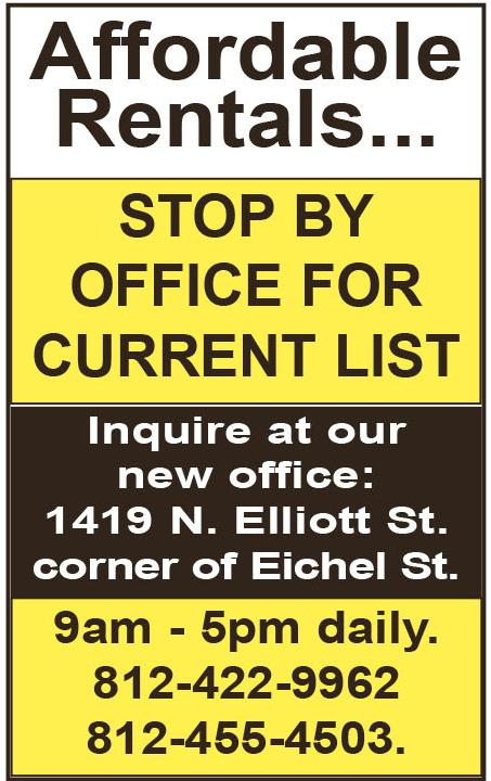 Efficiency, 1 & 2 bedroom, $495-$700 month. Laundry on site, Sun Porch, Off street parking, 812-424-0431