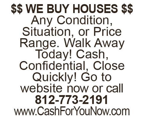 I BUY UGLY Houses, must need major work. 812-8975318 or 812-455-4503. OLD HOUSES Wanted. I buy old houses that need repair, work done. Fire damaged, storm damaged, termite damaged. Major structural problems, etc. I’ll do all paper work, 3 day service. A no problem sale for you. 812-897-5318, 812-4554503, 812-897-5319, 24 hour fax line.
