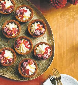 Carefully remove cooled crusts from pan. Pipe filling into crusts (about 3 tablespoons each). Before serving, top each pie with about 1 2 teaspoon cranberry compote. Top with sugared cranberries and orange zest. Serve remaining compote on the side.