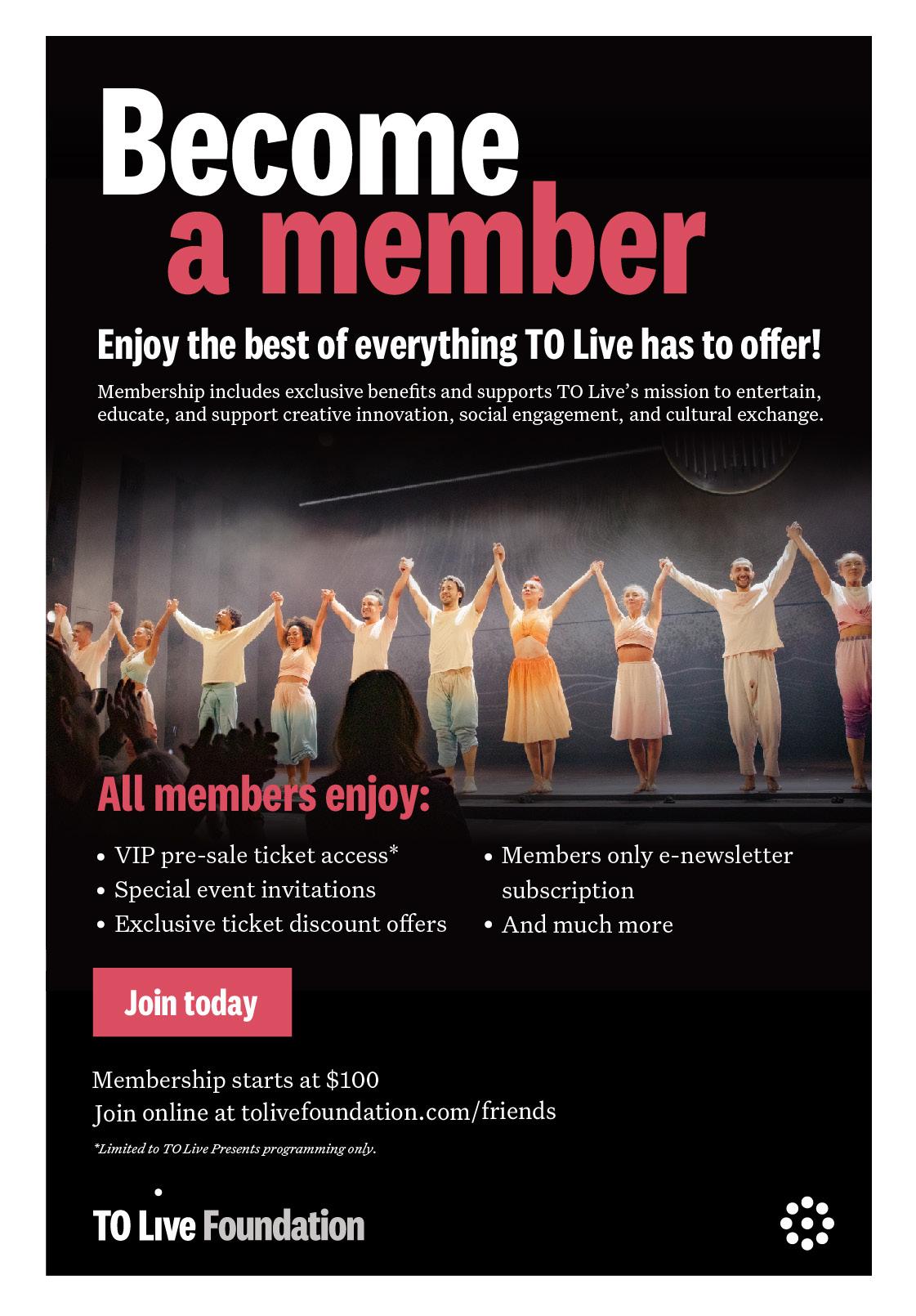The TO Live Foundation is committed to creating a future where art engages and inspires all Torontonians. A future where all the creative voices of our diverse communities are heard and celebrated. A future where artists have the support they need to experiment and grow.