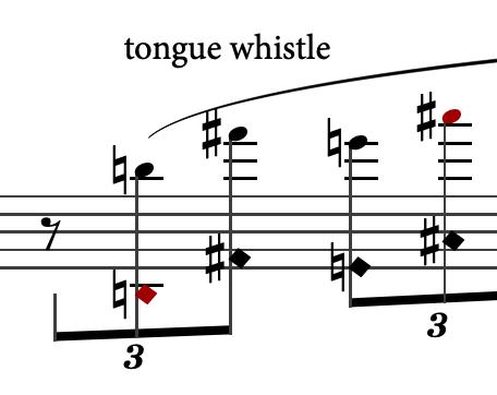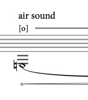air - air sound, embouchure open or fully enclosed as indicated, blowing of phonetically coloured air noise over the embouchure hole or inside the embouchure hole (phoneme denoted in brackets), seamless transitions with normal tones regulated by the lip tension