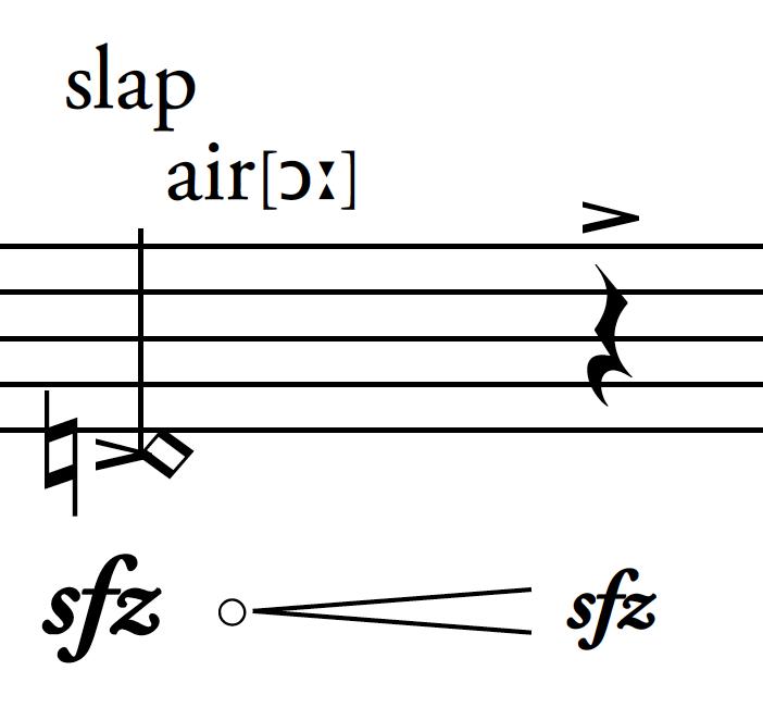slap - slap tonguing followed by the normal produced tone, indicated by the added small-sized notehead, also combined with multiphonics