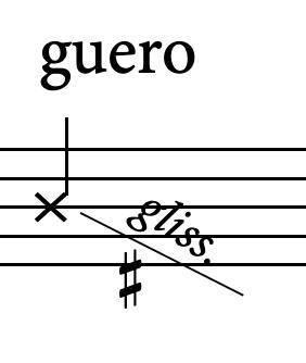 crunch - crunching, cracking or squeaking sounds, slow bowing with severe overpressure, on indicated open or muted strings, and on stopped tones, indicated by square noteheads, over the fretboard (T) dry and pitchless, near and over the bridge (poco, P) strident with spectral components
