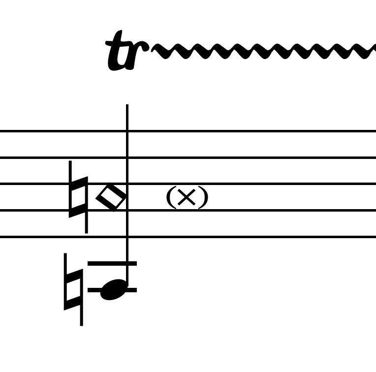 t.r. - tongue ram: fngering indicated by diamond-shaped notehead, resulting pitch displayed as wedge-shaped notehead