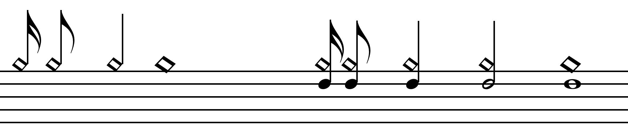 Single diamond-shaped noteheads representing harmonics and air-sounds are applied to all note values, except for minims. For harmonics depicted with the fundamental tone or air-sounds with the transposition, the small sized regular notehead differentiates between crotchets and minims, so that all values can be distinguished without exception.