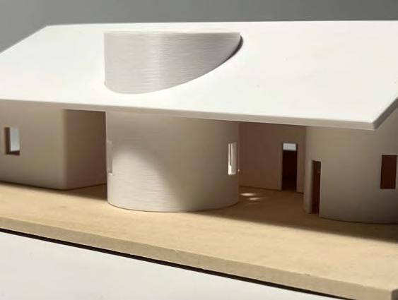 After exploring the methodology of using Ai to create renderings, modeling and exporting gcode from Rhino/Grasshopper, and printing with a 3D clay printer, the final project of the semester was to create a 1,000 sq ft single-family house that could be printed at full scale with a clay printer. The house produced contains four individual volumes, inspired by previous 3D printed objects. Each volume has a separate spatial function, and the space in between the volumes provides outdoor communal space. The house reeinvisions the traditional dog-trot style homes that might be seen throughout Arkansas.