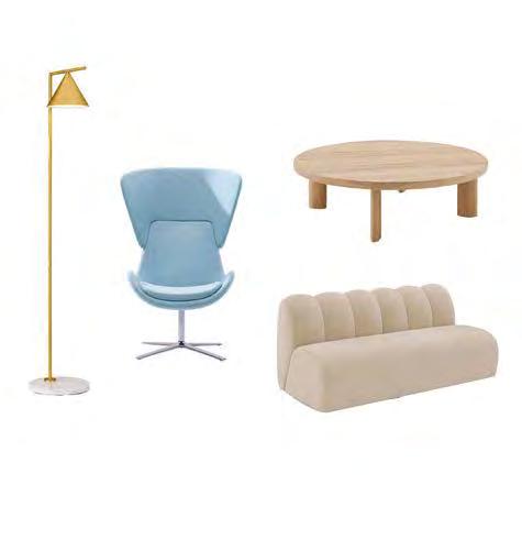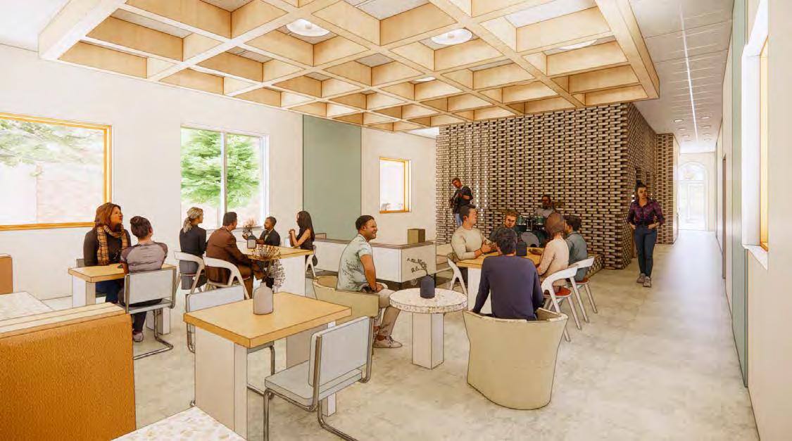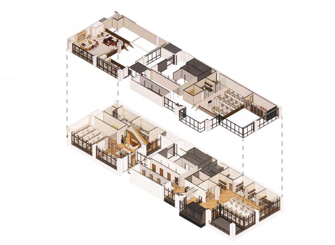 The NEXT project was a fictional global architecture and design firm opening a new o ce in Dallas, Texas. The space was about 11,000 sf and the ceiling height was 30 ft. The design in the NEXT o ce includes sleek materials and open airy spaces. Upon entering the space, the brass laminate covered monumental staircase and waiting area sets the tone for the rest of the space with the use of material and furniture. Each o ce has visibility to the workstations, and all of the spaces are accessible. The design encourages employees to work in person by o ering a programmatic variation of spaces.