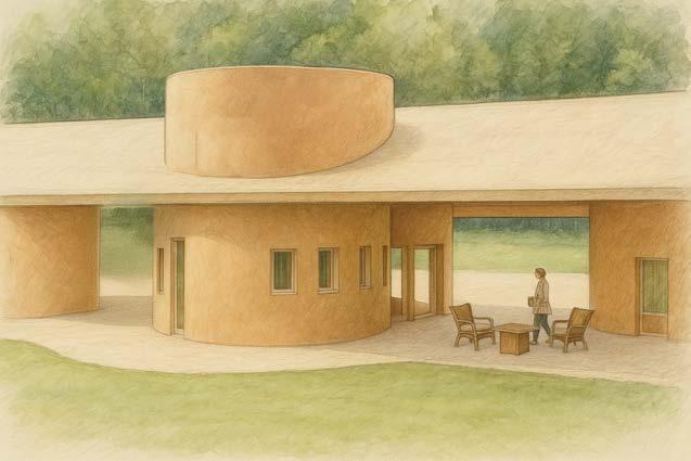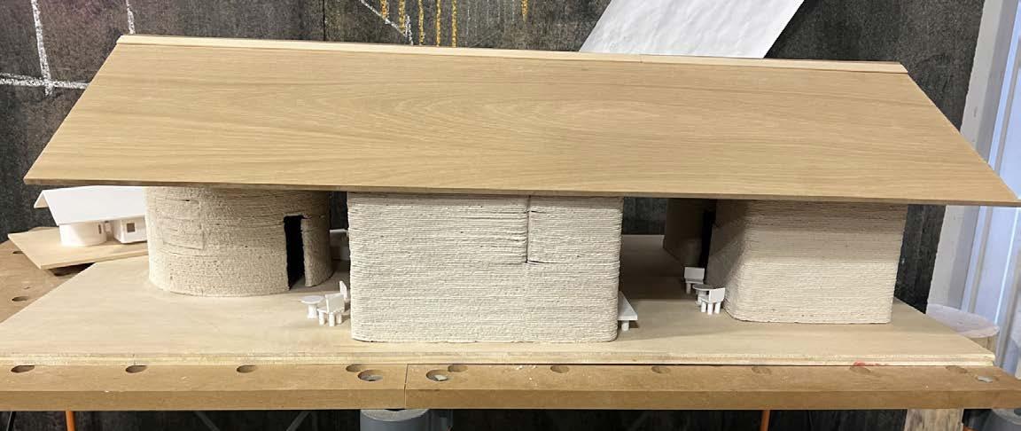using Ai to create renderings, modeling Rhino/Grasshopper, and printing with a 3D semester was to create a 1,000 sq ft printed at full scale with a clay printer. individual volumes, inspired by previous a separate spatial function, and the provides outdoor communal space. The dog-trot style homes that might be seen
