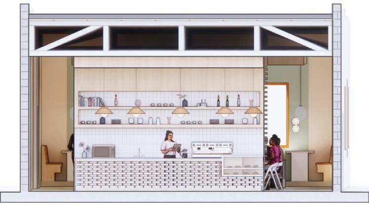 Design a coffee shop and wine bar using an existing building in Springdale, Arkansas. Experiment with a natural material and incorporate it throughout the design.