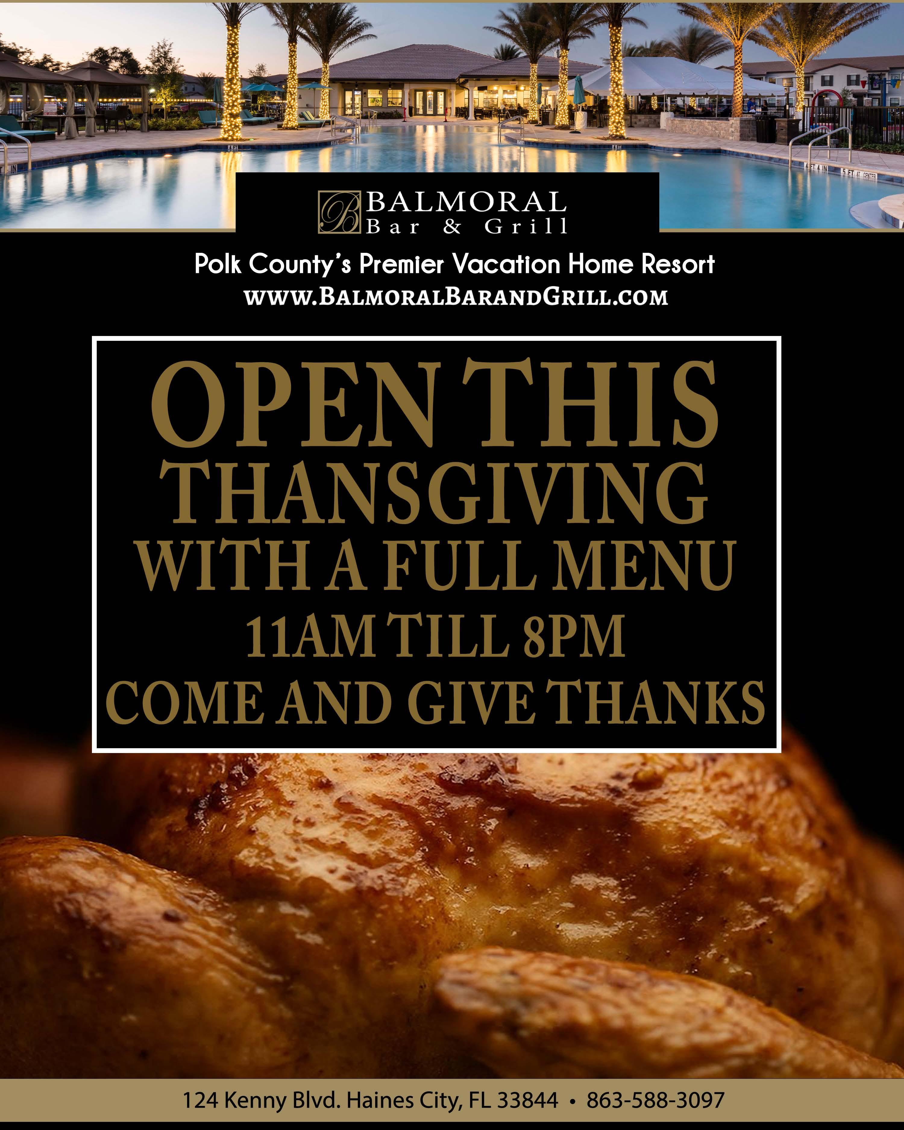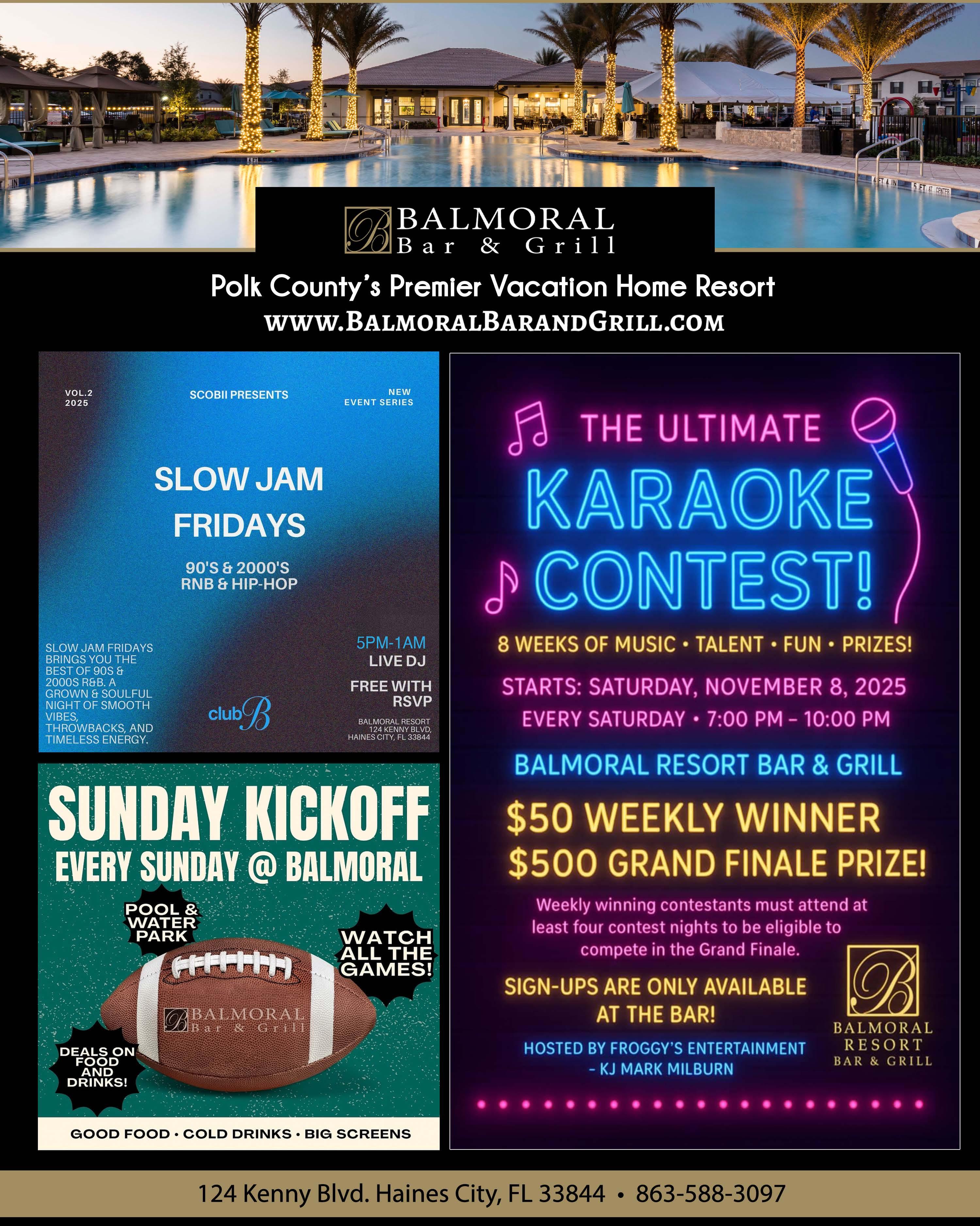 Offering a casual dining environment complete with poolside outdoor seating, the Balmoral Bar & Grill serves up poolside lunches, afternoon drinks and evening meals. Popular among resort guests and locals alike, our poolside bar in Haines City offers a full bar with TVs and features a menu of shareable appetizers, fresh salads, delicious sandwiches, and more. Live music also offered on the patio most Saturday nights. Check our Facebook for schedule. Bar & Grill is open to the public and is located within Balmoral Resort Florida in Haines City, minutes from Winter Haven and Davenport.