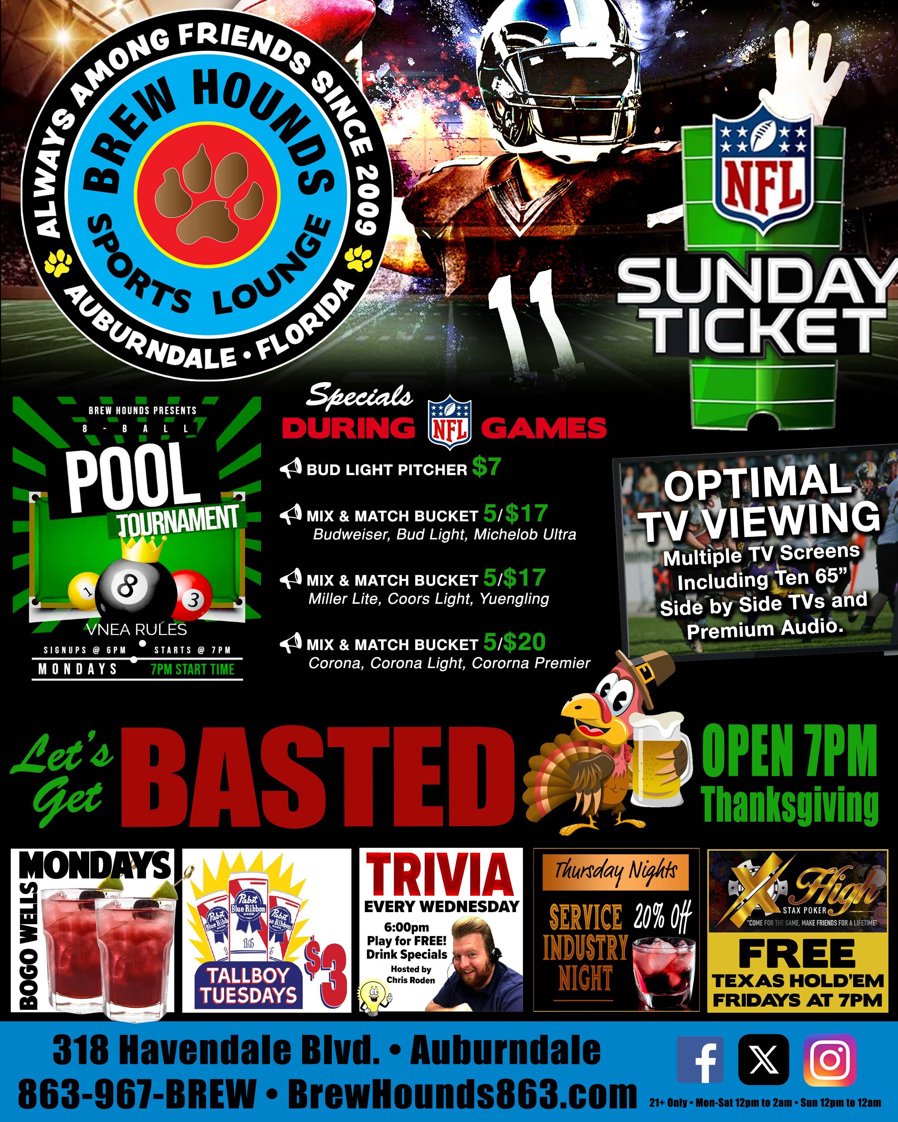 Lakeland’s Best Family Sports Pub. 40+ HD TV’s, NFL Ticket Sundays, NCAA Gameplan Saturdays. Happy Hour 2-4-1 All Day, Everyday. Bingo Mondays from 5-6 pm. Kids Eat Free Wednesday from 4-8 pm. Trivia Night on Thursdays from 8-10 pm.