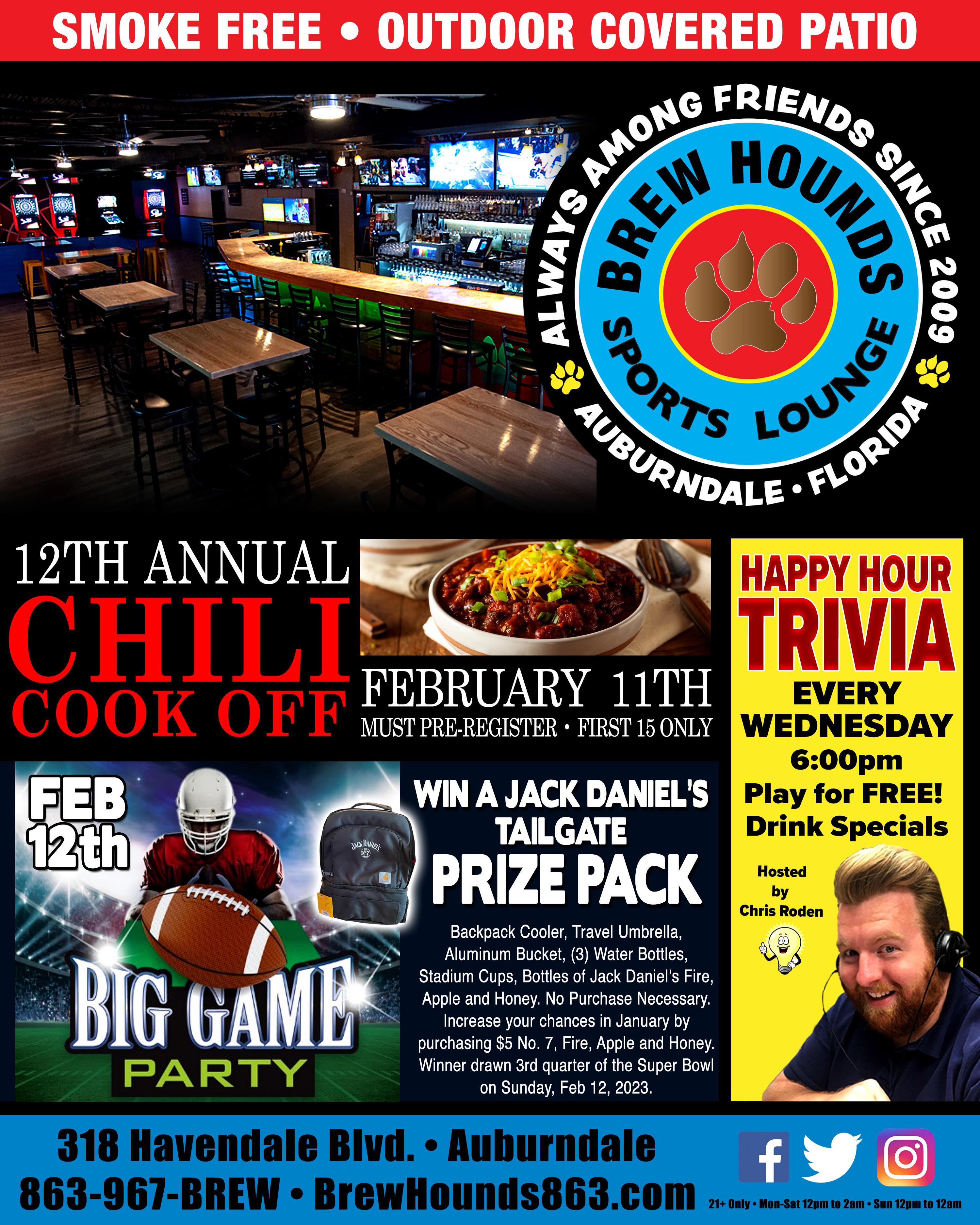 EXPECT MORE... GET MORE... WE DELIVER! FEBRUARY 2023 11 NEW THIS YEAR! Guests pay $5 which includes chili tastings for the “People’s Choice” Award, 5 tickets to vote for your favorite chili and a BOGO drink card. After the judging is completed additional bowls of chili will be available for $3 each. Basket Raffle & 50/50 Raffle to raise money for the Humane Society of Polk County. Benefiting HEY CHILI HEADS! Join Us For Our Annual Chili Cook-Off • February 11, 2023 • Judging Starts at 1:00 Chili Judged On: Overall Taste Aroma Color Presentation Texture/Consistency Donations also accepted for the Humane Society of Polk County. www.humanesocietyofpolkcounty.org/donate/wish-list/