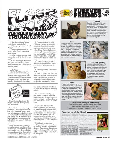 1. Name the girl group that released “Nothing But a Heartache.” 2. Which group had their album pulled by Disney on release day? 3. Two duos released “Mockingbird” a decade apart. Who were they? 4. Which artist had his only No. 1 hit ANSWERS: with “Rock Your 1. Dance club bouncers, who Baby”? would ban dancers from doing 5. Name the song that contains this the new wave pogo, which was violent, individual dancing and a lyric: “There, like a dream, this wondanger to others. The song demanded freedom of expression. derful night, I gazed at the grotto aglow in the light.” you are ready to start your taxes, all items will be together and easy Answers to find. “To help moisten really dry 1. The Flirtations,•feet, in 1968. slather on lotion, wrap feet in plastic wrap, then slip on some 2. Insane Clown Posse, in-- or1997. socks overnight for as longAt as you can stand it.” -- B.H. in Mich• If you store nail polish in the the last minute, Disney objected to igan fridge, it will dry more quickly and last longer. the graphic nature •of “My the no-ironlyrics. tip: I toss the Just wrinkly garment into the dryer • “In cold winter months, keep weeks earlier, the Baptist forSouthern about five to 10 minutes with your robe (and slippers or whata damp washcloth, and it steams ever else) under the covers with Convention had toIt won’t boycott look you when you sleep. Pull it nextthreatened to most wrinkles out. starched and pressed, but it’s or over you a few minutes before Disney businesses because ofwearGay good enough for casual or you get up. It’ll be toasty and will running-late mornings. I haven’t help make the transition into the ironed in years.” -- E.W. in Florida Days cold a littleat less Disneyland. harsh.” -- G.G. in New York • Don’t forget to clean your 3. Inez and Charlie Foxx, the songwashing machine every so often • As tax time draws ever closer, running it on the highest-temwriters, inmanila 1963, andby Carly Simon and try taping a large envelope to the fridge, leaving the top open. perature cycle empty after adding a gallon of vinegar. This will clean ImmediatelyTaylor place all tax-related James in 1974. forms and receipts in the envelope out the hoses and get rid of stuckon detergents. as they come in. This way, when 4. George McCrae, in 1974. McCrae EXPECTonly MORE... GET MORE... WE DELIVER! not had a No. 1 hit, but it also netted him a Grammy nom for Best Male • Window frames can be tricky to clean. And they are a magnet for dust and dirt, or worse — condensation that can lead to mold. To get into the crevices, employ a toothbrush sprayed with a tiny spritz of furniture polish. It works! • “Firing up the grill? Don’t get hasty. Preheat. Cooking times are based on an even cooking temperature, and you’ll get that good sear on your steaks or chicken. Use a grill thermometer and you’ll know when just the right time is to put dinner on the grill!” — T.E. in South Carolina • Ever wonder how long your peanut butter will last? On the pantry shelf, you can expect it to hold for 7-12 months if stored in a cool dark place. After opening, it will last 3-4 months in the fridge. • Smudged mascara? Remove it on the fly with a little bit of lip balm. Simply run your finger over the lip balm, then carefully remove the smudge. You also can put a bit of the lip balm on a tissue and use that instead. • “I dropped a glass in the kitchen, and there were a ton of small pieces.