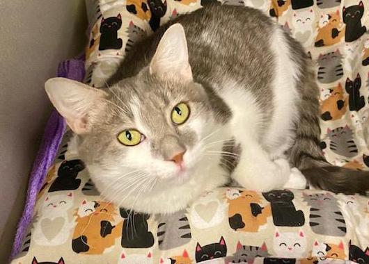 Chatty is a grey and white female Domestic Shorthair mix. She is approximately 4 years old. Chatty gets her name from her very talkative personality! She will sometimes growl, but that's just her way of showing love! Chatty can be shy with new people at first but warms up quickly. She has had some positive experience with a dog but does not seem to prefer being around cats